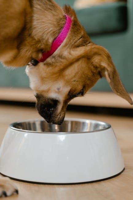 Large breed puppies require a consistent feeding schedule to support healthy growth. Puppies under six months old typically need 3-4 meals daily, while those over six months can transition to 2-3 meals. Fromm recommends dividing the daily ration into smaller portions to prevent overeating and promote steady digestion. As puppies grow, their feeding frequency can gradually decrease, aligning with their energy needs. It’s essential to avoid free-feeding and stick to a structured plan to prevent obesity and joint issues common in large breeds. Always consult a vet to tailor the feeding schedule to your puppy’s specific needs and growth patterns.